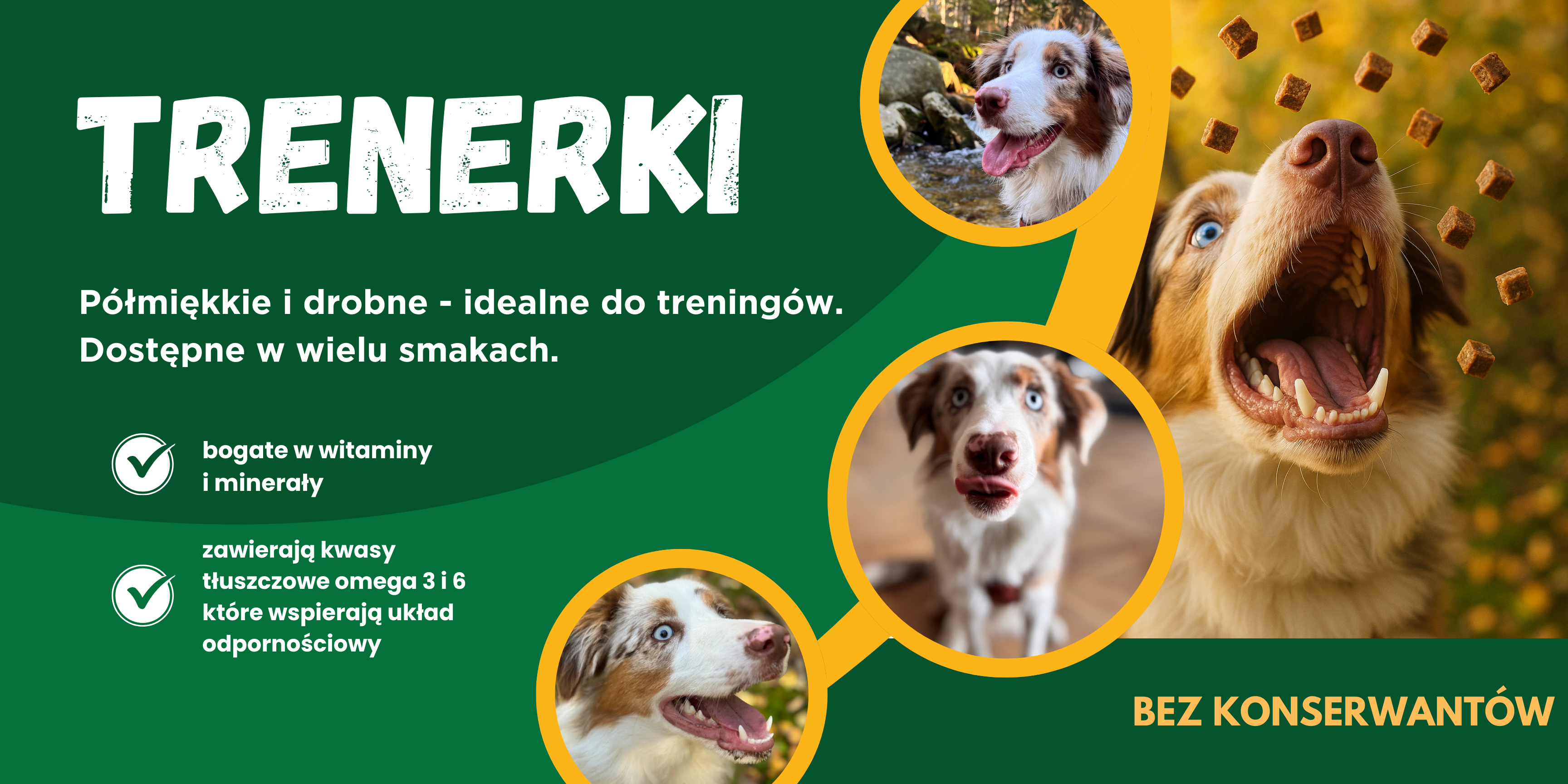 Dostępne w wielu wersjach smakowych - oparte na jednym rodzaju mięsa, przez co są bezpieczne dla alergików oraz podczas stosowania diety eliminacyjnej. Nie zawierają dodatku gliceryny. Uniwersalne, odpowiednie dla wszystkich psów - od najmniejszych do największych, a nawet dla kotów!